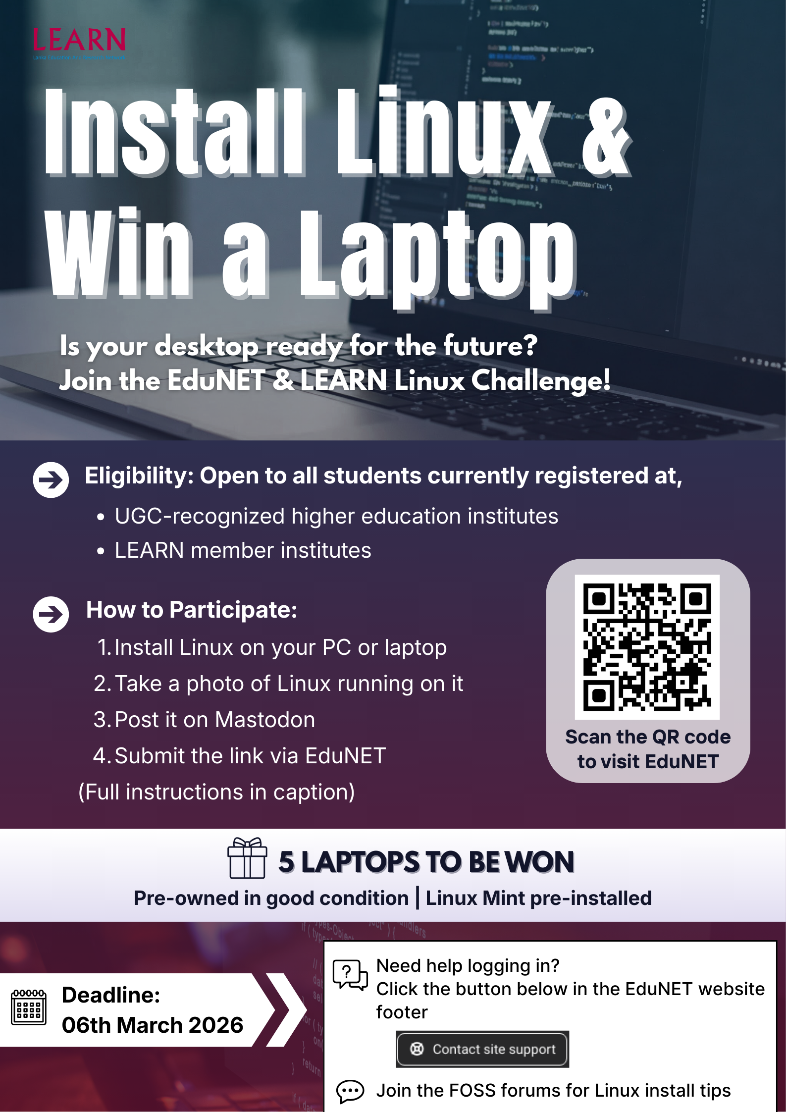 Ready to embrace the future of the desktop? EduNET, in collaboration with LEARN, is excited to announce a special competition for the student community! Make the switch to Linux today and you could walk away with a Linux laptop.